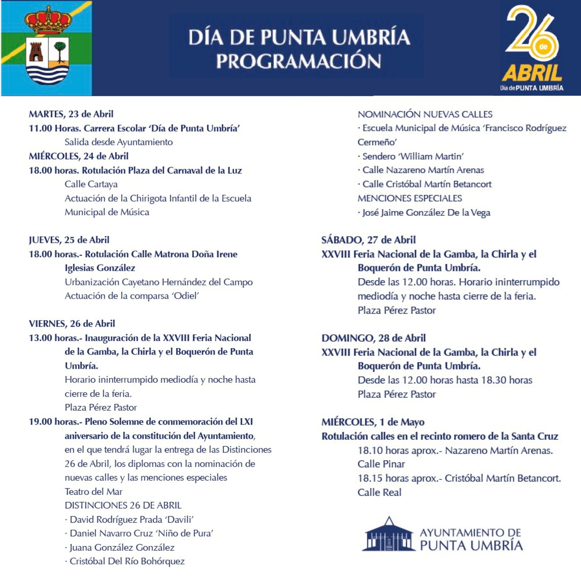 Punta Umbría, 18 de abril de 2024.- El alcalde de Punta Umbría, José Carlos Hernández Cansino, acompañado de la concejal delegada de Presidencia, Jimena Donoso, ha dado a conocer el programa de actividades que ha preparado el Ayuntamiento para conmemorar el 61 aniversario de la independencia de Punta Umbría del pueblo de Cartaya, que arranca el próximo 23 de abril y se prolongará hasta principios de mayo.